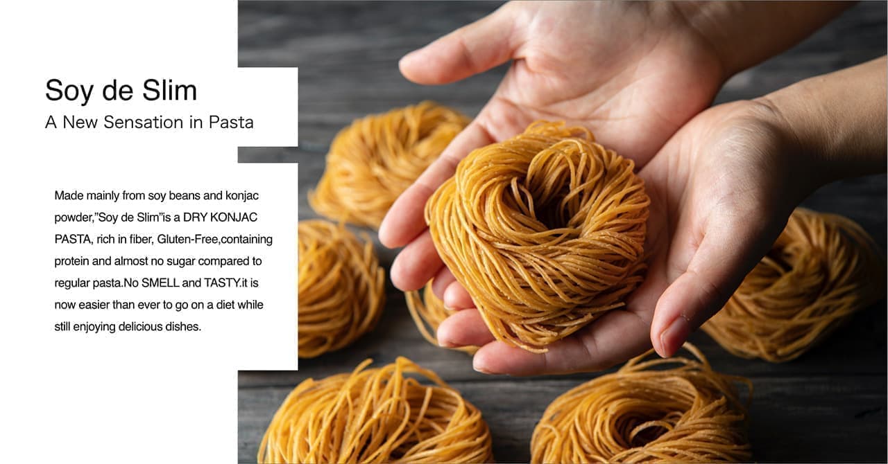 Made mainly from soy beans and konjac powder,”Soy de Slim”is a DRY KONJAC PASTA, rich in fiber, Gluten-Free,containing protein and almost no sugar compared to regular pasta.No SMELL and TASTY.it is now easier than ever to go on a diet while still enjoying delicious dishes.